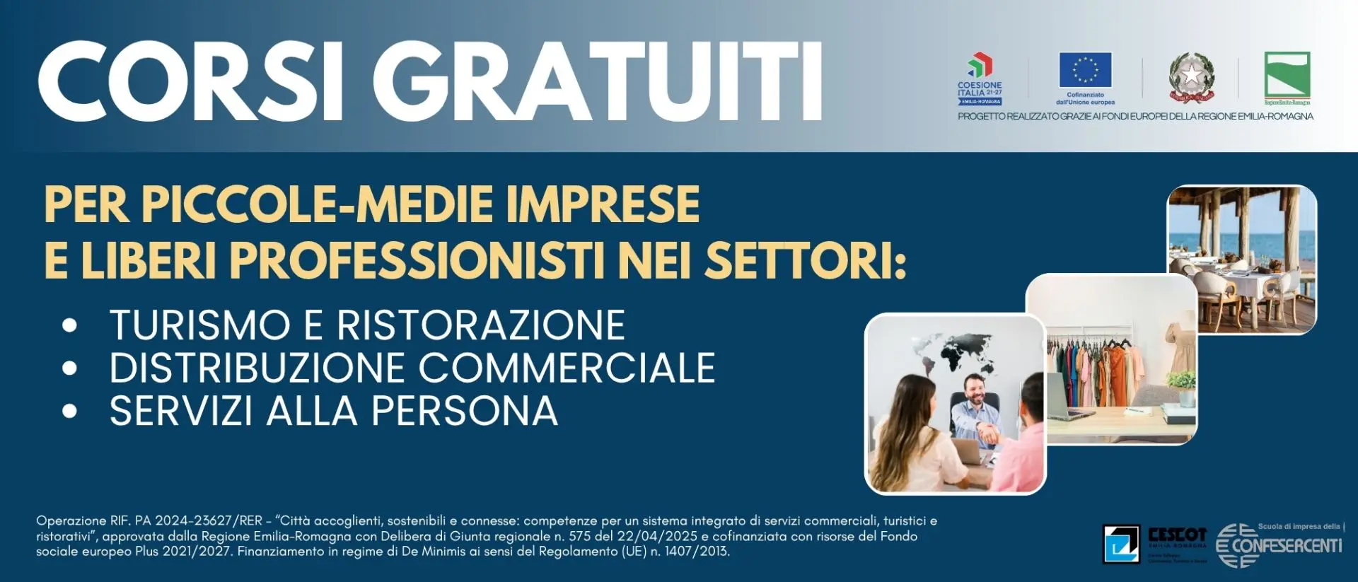 Operazione RIF. PA 2024-23627/RER – “Città accoglienti, sostenibili e connesse: competenze per un sistema integrato di servizi commerciali, turistici e ristorativi”, approvata dalla Regione Emilia-Romagna con Delibera di Giunta regionale n. 575 del 22/04/2025 e cofinanziata con risorse del Fondo sociale europeo Plus 2021/2027. Finanziamento in regime di De Minimis ai sensi del Regolamento (UE) n. 1407/2013.