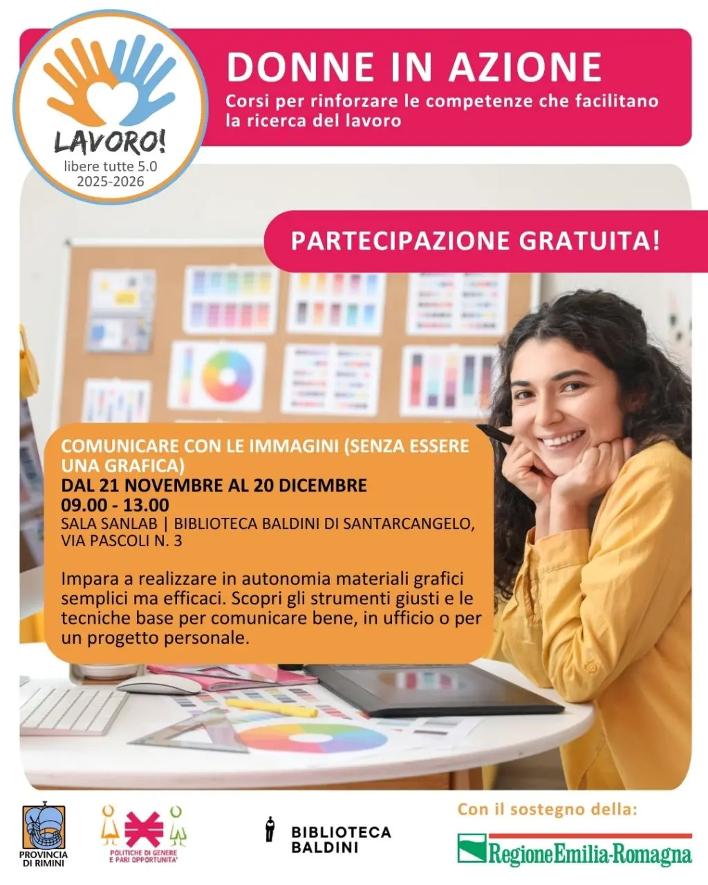 Il corso si terrà il 21, 26 e 28 novembre e il 3, 5 e 10 dicembre (ore 9:00–13:00) presso la Sala SanLab – Biblioteca Baldini di Santarcangelo (Via Pascoli 3).