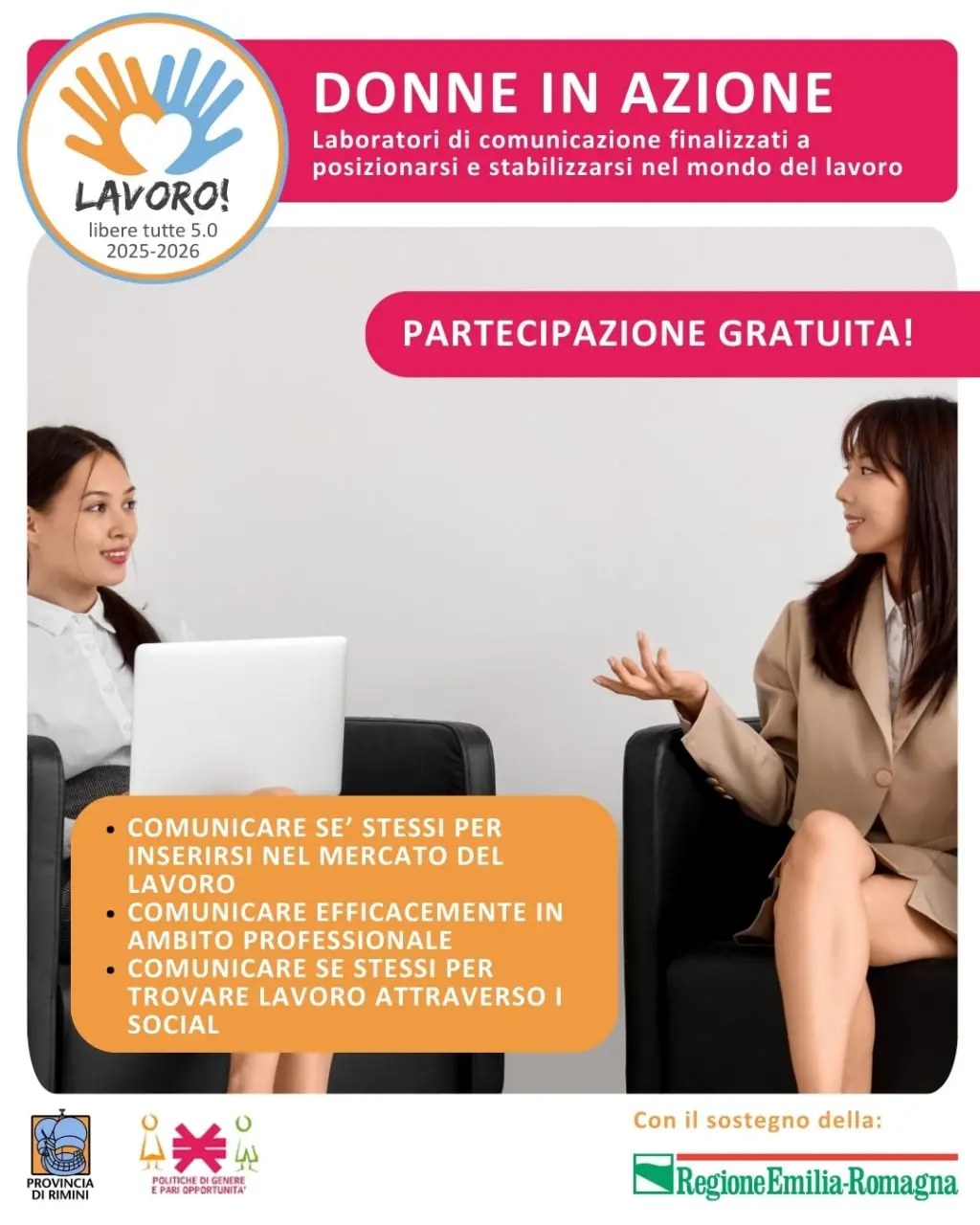Lavoro Libere Tutte 5.0 è un progetto promosso dalle Pari Opportunità della Provincia di Rimini in collaborazione con:
